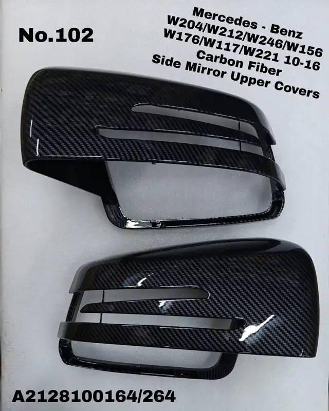 Improve the look and style of your Mercedes Benz with our Side Mirror upper covers. Made from carbon fiber, these covers are compatible with C-CLASS W204, E-CLASS W212, W221, W117, W176, W246, and W156TAG-SMC-102 models. Upgrade today for a sleek and modern appearance.