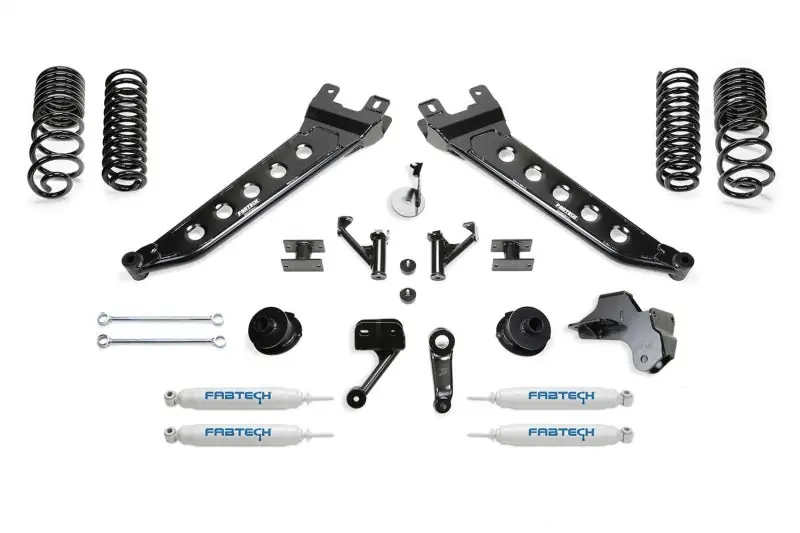 - Improving on the Ram suspension design, Fabtech offers their trademark Radius Arms in a complete lift kit system. These exclusive tubular Radius Arms have recognizable dimple die side plates for superior strength and a signature of quality. The rugged Arms provide increased caster for use with oversized tires and lifted suspension heights. The factory front Ram coil spring has a noticeable bow to it with a very high spring rate for the weight rating of the vehicle. This creates a harsh ride with a nervous feel from the suspension. To correct this, Fabtech uses a straight vertical coil design. In order to utilize a straight coil, the lower spring seat mount must be modified via a Fabtech patented angular spring mount that attaches to the stock seat. This eliminates the bow to the spring and allows for a lower rate with a straight coil for a supple ride without sacrificing load carrying capacity. A Fabtech exclusive. For the rear, this lift kit has the perfect balance between ride quality and retaining the factory carrying capacity. By utilizing a dual rate spring design, it provides a good highway ride in the first stage of compression and then the second stage handles heavy loads. Heavy duty 1/4″ thick steel front and rear Track Bar drop brackets center the axles under the vehicle with the new ride height. A Fabtech innovation with this Ram lift kit is the heavy duty steel front bump extensions. They retain the stock bump stop cushions for progressive damping and will not allow the suspension to over travel. This is a superior feature compared to replacement long length urethane bump stops as they can push out under harsh conditions. FEATURES: Fabtech?s trademark Radius Arms with recognizable dimple die side plates providing additional strength and increased caster. Front straight Coil Springs with Fabtech?s patented angled mounts for smooth ride. Heavy duty Track Bar drop brackets center the axles under vehicle for proper tracking. Dual rate rear coil spri