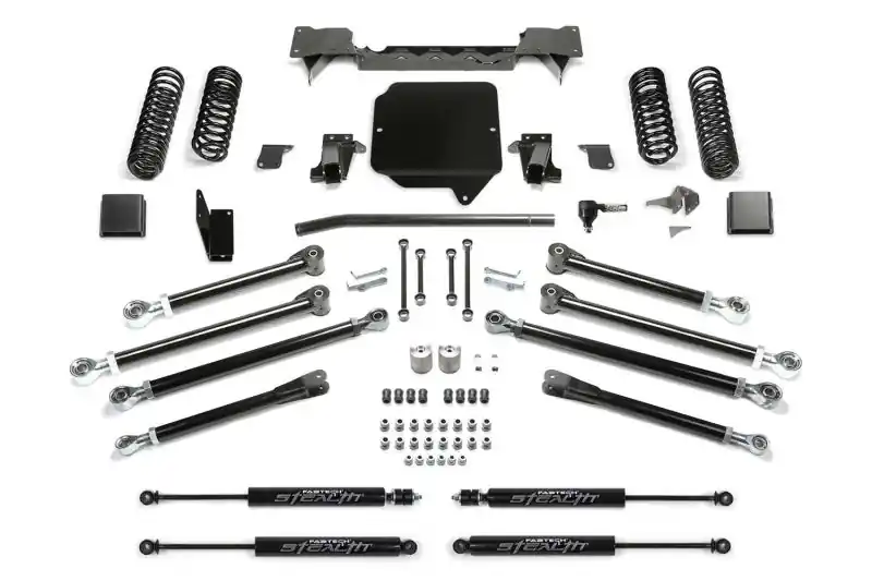 - Fabtech’s Crawler long arm Gladiator lift kit is built to meet the most experienced driver’s expectations without having a questionably fabricated suspension. If you are in the market for a system that will work properly right out of the box and does not require continued fabrication and constant maintenance, look no further. A key part of the Crawler kit is the Link Arm geometry and ground clearance. The location of the of the link arms is critical in providing superior handling throughout the travel range. Fabtech has found the Gladiator’s sweet spot geometry for the link arms that provide a superior driving long arm system compared to all others on the market. Front link arms are mounted to a full width crossmember that spans frame rail to frame rail. This crossmember is key in not only in mounting the Links arms at the correct geometry but it adds critical strength to the Gladiator frame for hard offroad use. Adjustable rear links utilize the factory frame and axle brackets for an easy installation. The Fabtech lower Link Arms are massive and built of 2in OD .313 thick wall tubing that is guaranteed not to bend. Upper and lower Link Arms includes the Fabtech’s legendary 5 Ton joints that come with lifetime guarantee of never wearing out. They are superior for offroad use with a smooth quiet operation on the street. This high quality Long Arm Gladiator lift kit will provide exceptional offroad performance with good highway manners for the discerning Jeep enthusiast. Each Fabtech component has been designed with specific features and benefits that create this quality suspension system. What’s In The System: Front Upper and Lower Link Arms. Rear Upper and Lower Link Arms. Front Link Arm Crossmember. Heavy Duty Flipped Draglink. Front and Rear Track Bar Brackets. Front and Rear Corner Specific Dual Rate Coil Springs. Front and Rear Sway Bar Links. Front Shock Mount Bracket. Front and Rear Bump Stop Extensions. LINK ARMS: Heavy duty is the only way to describe these