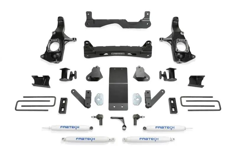 • Fabtechs new 4 crossmember systems utilize their proven heavy duty construction and design features for a robust suspension upgrade. The 4 system features high arched lower control arm crossmembers constructed of 1/4 thick steel for maximum strength. The Fabtech ductile iron steering knuckles retain the near stock track width keeping tires under the fender for a clean appearance. Rear lift is accomplished with a block and u bolt configuration.