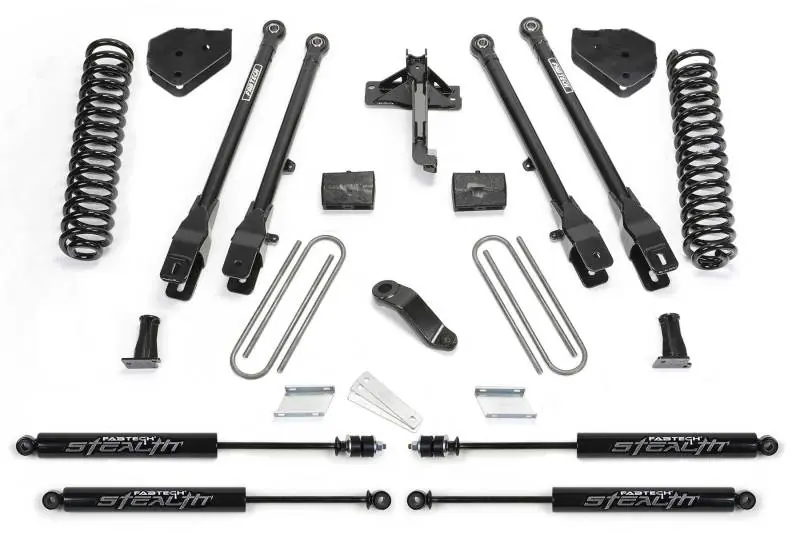 - Fabtech?s 6? 4 Link Conversion system for the Ford F450 and F550 Super Duty is built to handle the on and offroad demands of the truck enthusiast. This vehicle?s suspension is more robust than the Ford F250 and F350 and therefore demands specialty parts only available from Fabtech.This system comes with everything needed to convert to a 4 Link front suspension. The system will provide less caster change throughout the travel range which benefits on road driving. Offroad the 4 Link system will provide more articulation than a Radius Arm for increased terrain traversing at all speeds.Fabtech?s 4 Link System has been proven in over 10 years of service in consumer, commercial and military applications. High quality components with properly design suspension geometry is the pinnacle of Super Duty suspension systems.Each Fabtech component is expertly built in house.Fabtech Heavy Duty Link Arms.Fabtech Front Coil Springs.Trac Bar Relocation Bracket.Sway Bar Drop Brackets.Pitman Arm.Rear Block & U-bolt Kit.Includes front and rear Stealth shocks.