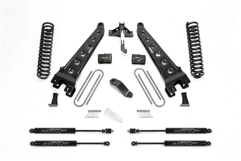 - Fabtech?s 6″ Radius Arm lift kit for the Ford F450 and F550 Super Duty is built to handle the on and offroad demands of the truck enthusiast. This vehicle?s suspension is more robust than the Ford F250 and F350 and therefore demands specialty parts only available from Fabtech. This Radius Arm system is a complete upgrade to the factory suspension and will provide additional strength for use with oversized tires. The design has been proven in over 10 years of service in consumer, commercial and military applications. High quality components with properly designed suspension geometry is what sets this system apart from all other Radius Arm suspensions. Each Fabtech component has been designed with specific features and benefits that create this quality suspension system. For a greater understand of each these components please see below. FEATURES: RADIUS ARM – Tubular construction with dimple die side plate for superior strength. Arms are offset to allow for full turning radius of the Dana Super 60 front axle with wide tires. Fabtech Radius Arms have 1 degree of caster built in for the increased ride height. Adjustable alignment cams on the Arms allow for an additional 1.5-2 degrees of caster adjustment. COIL SPRINGS – American made coil springs have been designed for a very compliant ride quality both on and offroad. Each coil is preset during the manufacturing process to insure no ride height settling over time. Allows for a 2″ increase in wheel travel over stock when used with Fabtech shock absorbers. TRACK BAR BRACKET – 1/4″ thick steel bracketry repositions the factory track bar to center the axle under the vehicle with the increased lift height. Super stout box style bracket is designed to eliminate deflection when the track bar moves through its full cycle. DROPPED PITMAN ARM – Forged steel construction with high strength material that exceeds the factory specifications. Designed specifically for the F450 and F550 to work in conjunction with the factory