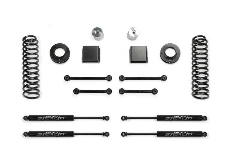 - This Sport lift kit is Fabtech?s most popular Jeep system providing increased ride height and suspension performance at a great price. Installation is easy and can be installed in a couple hours. The Sport lift kit features American made front coil springs that are a dual rate design allowing extended suspension travel for offroad use while providing a smooth highway ride. The first stage of the spring provides a soft ride with the ability to extend for additional travel. The second stage is designed to handle the payload of the vehicle and address large impact absorption at higher speeds. The rear of the vehicle receives coil spring spacers retaining the factory ride and load carrying capacity. The spacer height is 1-3/4″ to help level the stance of the vehicle. Four bump stops extensions utilize the factory bump stops for compliant cushioning at full compression. The extensions retain the stock down travel to eliminate over cycling of the suspension and driveline. The extended length front and rear sway bar links with urethane bushings reposition the bars to work within the factory operating planes. By extending the length of the links, it prevents the sway bar from going over center and creating bind at full extension travel. Stealth monotube shocks are included in the popular Gladiator lift kit to provide enhanced on and offroad damping. This Gladiator lift kit is an excellent choice for the Jeep enthusiast that wants to run larger tires with enhanced offroad capability and a good highway ride. WHAT?S IN THE SYSTEM: Front Dual Rate Coil Springs, Rear Coil Spacers, Front & Rear Sway Bar Links, Front & Rear Bump Stop Brackets, Free 5 Year 60,000 Mile Powertrain Warranty.