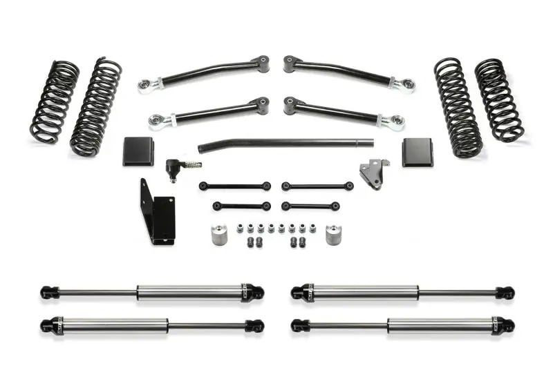 - This Trail Lift Kit provides enhanced suspension performance to address all variants of off highway travel use including rock crawling, aggressive trail use and overland expeditions. This Gladiator lift kit has been tuned with proper dual rate coil springs and shock valving to provide a very compliant ride that you will appreciate. The system is a complete short arm suspension that utilizes the factory lower control arm mounts for an easy installation. The Fabtech lower link arms are constructed of thick wall steel tubing that are guaranteed never to bend. They come with large polyurethane bushings on one end with internal threads on the other to accept the groundbreaking Fabtech 5 Ton Joint? for longevity and a quiet ride. Fabtech?s dual rate Gladiator coil springs are corner specific to the Jeep JT. This keeps the vehicle level side to side and allows for increased suspension travel. The first stage of the spring provides a soft ride with the ability to extend for additional travel. The second stage is designed to handle the payload of the vehicle and address large impact absorption at higher speeds. To address the steering geometry with the increased ride height, a Draglink Flip kit along with a heavy duty Track Bar bracket is included. This relocates the Gladiator steering geometry to the factory plane allowing for full articulation without binding the draglink ends in extreme conditions. The rear Gladiator suspension receives a heavy duty Track Bar bracket to center the axle under the vehicle with the new ride height and help retain the factory roll center of the vehicle. Front and rear bumps stop extensions protect the Jeep Gladiator suspension from over cycling. This popular Jeep Gladiator lift kit is a top choice for daily drivers that enjoy tackling tough trails and overlanding with the comfort that they have a high quality complete suspension under their Gladiator. FEATURES: CONTROL LINK ARMS – Proper factory bushing cross bolt angles are parallel