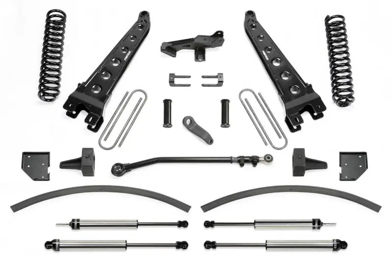- Fabtech?s 8? Super Duty suspension systems incorporate their proven Radius Arm and 4 Link designs with an all new offset Track Bar system specifically for the late model Super Duty platform.This innovative Track Bar system addresses the hyper sensitive steering box of the Ford Super Duty when increasing the ride height to 8? and running oversized tires. Fabtech is the only manufacturer with this ground breaking system that offers proper steering performance.Fabtech?s extended length Track Bar is 4? longer than stock and is offset to the driver side with a stout 1/4? thick steel mounting bracket. This design helps keep the Track Bar and Draglink closer to parallel than the factory angle to reduce push in the steering. The Track Bar allows for full lock steering of 15.50 wide tires w/ 5? BS wheels.The 8? System is available with heavy duty tubular Radius Arms or 4 Link Conversion System for outstanding on and offroad performance. Front spring options include performance Coil Springs or the Dirt Logic 4.0 Coilover Conversion system for maximum damping capacity. Dirt Logic 2.25 Stainless Steel shocks are included with these systems for a superior ride quality.These high end 8? Systems are the pinnacle of quality and ride performance for the 2017 Super Duty.Each system is a bolt on installation and comes with Fabtech?s 5 year 60,000 mile warranty.
