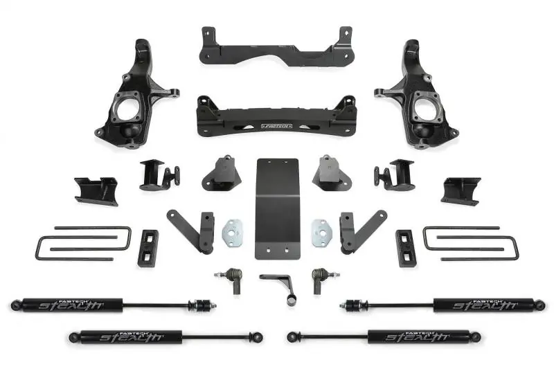 - Fabtechs new 4 crossmember systems utilize their proven heavy duty construction and design features for a robust suspension upgrade. The 4 system features high arched lower control arm crossmembers constructed of 1/4 thick steel for maximum strength. The Fabtech ductile iron steering knuckles retain the near stock track width keeping tires under the fender for a clean appearance. Rear lift is accomplished with a block and u bolt configuration.