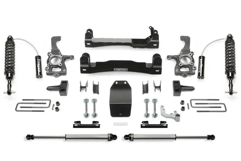 - Fabtech’s new 4” F150 system utilizes their proven heavy duty construction and design features found in our 6” systems but with less lift and at a much lower price. This 4” Systems allows use of 35” tall tires and features high arched lower control arm crossmembers constructed of 1/4thick steel for maximum strength. The Fabtech ductile iron steering knuckles retain the stock track width keeping the tires under the fender for a clean appearance. Rear lift is accomplished with a block and u bolt configuration.The Performance System features Dirt Logic Stainless Steel 2.5 Coilover front shocks and Dirt Logic Stainless Steel 2.25 rear shocks for aggressive offroad capabilities with a smooth highway ride.