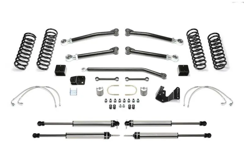 • Utilizing the factory link arm mounts Fabtech’s Trail short arm suspensions are built for aggressive offroad use while providing a smooth and quite highway ride. Each system has features and benefits that address all variants of off highway travel use including rock crawling, aggressive trail use and overland expeditions. The Trail system replaces the four lower link arms due to their vulnerability to offroad obstacles. Link arms come with large poly urethane bushings on one end with internal threads on the other to accept the ground breaking Fabtech 5 Ton Joint for longevity and a quite ride. These systems utilize Fabtech’s Standard coil springs that are a single rate design and provide great all around suspension performance. Factory load carrying capacities are retained in these quality springs. Includes Lower Short Arm Links Front & Rear, Standard Coil Springs Front & Rear, Adjustable Track Bar Front, Sway Bar Links Front, Track Bar Bracket w/ Support Rear, Brake Lines Front & Rear, E Brake Bracket, Front Bump Stop Extensions, Rear Bump Stop Brackets and Dirt Logic 2.25 shocks.