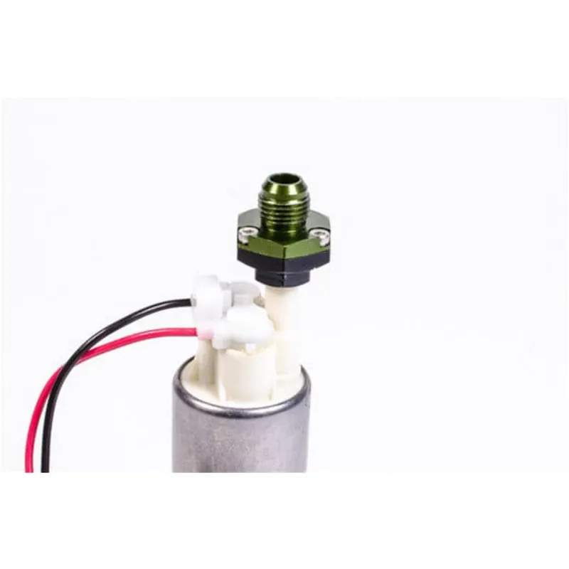 Radium Engineering Pump Outlet Adapter CNC machined Aluminum; Black and Green anodized; Stainless steel hardware; low-profile design