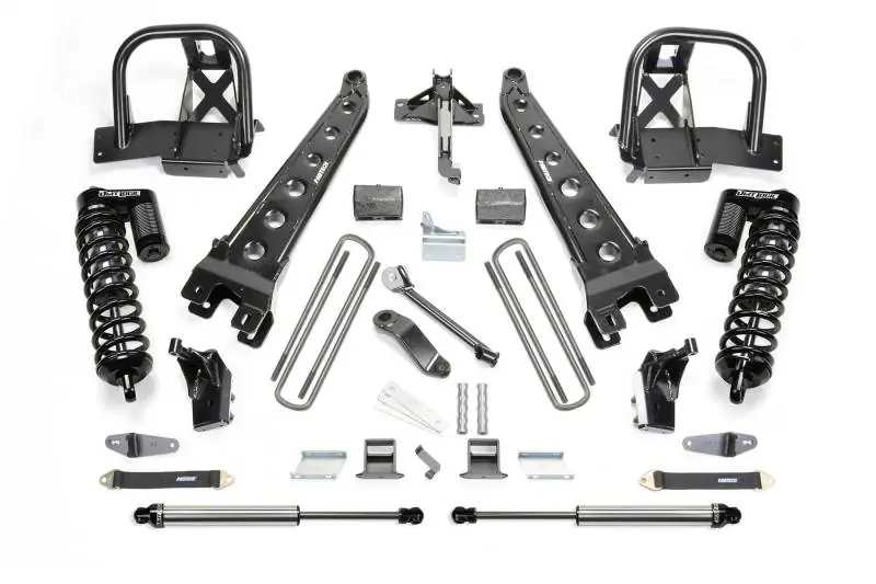 • Fabtech’s Coilover Conversion system is now available in a 4? lift height for use with Radius Arm and 4 Link Systems. This system utilizes the massive Dirt Logic 4.0 Coilover for a great highway ride with superior offroad capabilities.The Coilover Conversion system replaces the upper coil spring bucket with a tubular and plate style mount that reinforces the frame for rugged offroad use.The Dirt Logic 4.0 Coilover features a dual rate coil spring for a smooth ride. The stainless steel body and black NitroSteel? piston rod provide maximum corrosion resistance. The finned billet aluminum reservoir helps keep the shock cool during aggressive offroad driving.This high end Dirt Logic Coilover Conversion system is the ultimate suspension upgrade for Fabtech’s Radius Arm and 4 Link Suspensions.Includes rear Dirt Logic Shocks.Estimated installation time- 7-8 hours.6 holes to drill.No welding required.Front driveshaft modification may be required to clear exhaust on gas motor.
