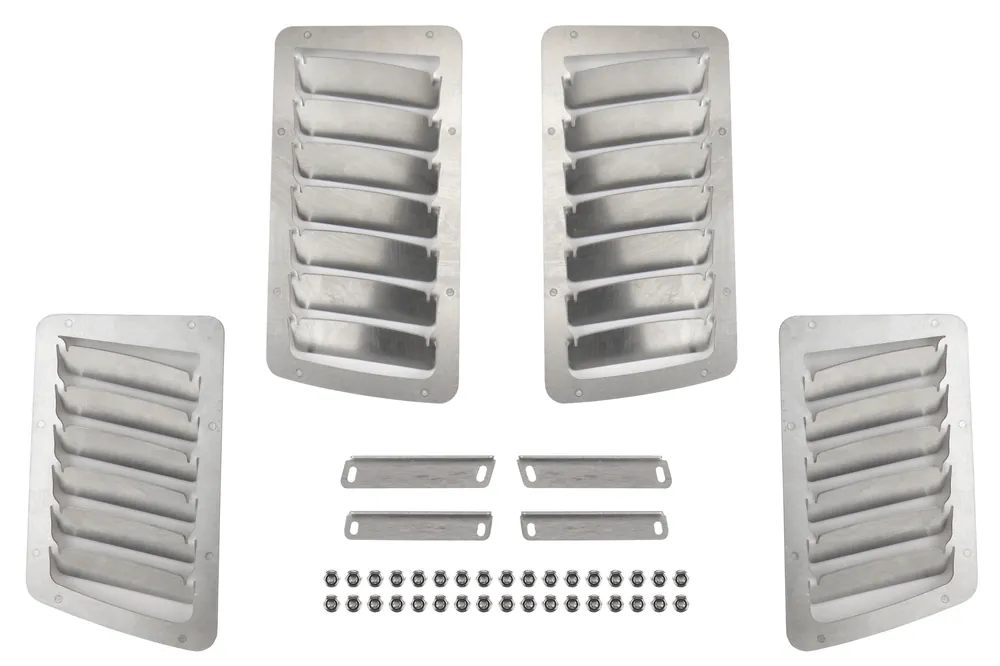 This new vent kit includes slant cut vents.Reduce under hood pressure and temps with this clean, OEM-esque add on while retaining the OEM’s hood rigidity by not cutting into the structural sheet metal below.Having a modular design allows the end user to pick from a multitude of configurations, from maximum evacuation using the wickers, to a cleaner look without, and an optional rain guard kit that collects water to dump it forward of the engine’s critical components.Available in a satin black powder coat or raw for those that want to color match.These have been tested and proven to greatly reduce multiple areas in the engine bay.Optional Rain Guards Available:See “related” items below.