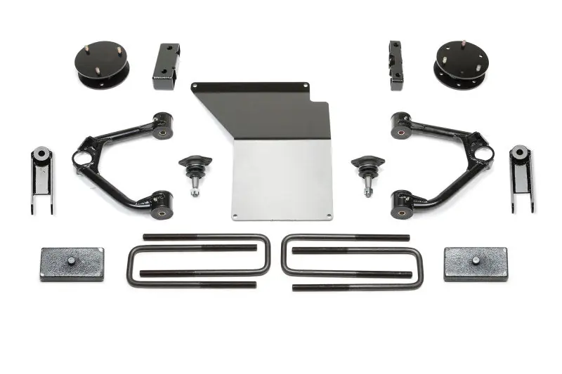 • This system offers a mild lift height with easy installation for clearance of 33″ tall tires on K1500’s w/ factory Magnetic Ride Control suspension.Lift is accomplished by utilizing the factory front Coilover shocks with steel spacer system that helps retain the stock ride of the front suspension. The stock upper control arms are replaced with thick wall DOM tubular arms that feature heavy duty extended range ball joints. These ball joints provide additional strength to the vehicles suspension compared to the factory.The front differential is relocated to keep CV angles proper with the new lift height while a 1/4″ thick steel skid plate provides protection against offroad obstacles.Rear lift is accomplished with 1 1/2″ rear lift block and u-bolts to help level the stance of the vehicles.- Value priced system with Fabtech qualityIncreased ground clearanceExtended range upper ball joints provide a smooth quiet rideIncreased fender clearance compared to a Leveling Kit for 33″ tall tiresSuspension can be restored to stock.